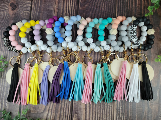 Silicone bead keychain bracelets with 2" light wood disc and tassel, engraving blanks