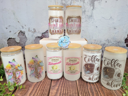 RTS 16oz Sublimation Ready Glass Can tumblers with bamboo lid and plastic straw, Clear or Frosted, sublimation blank glass can cups