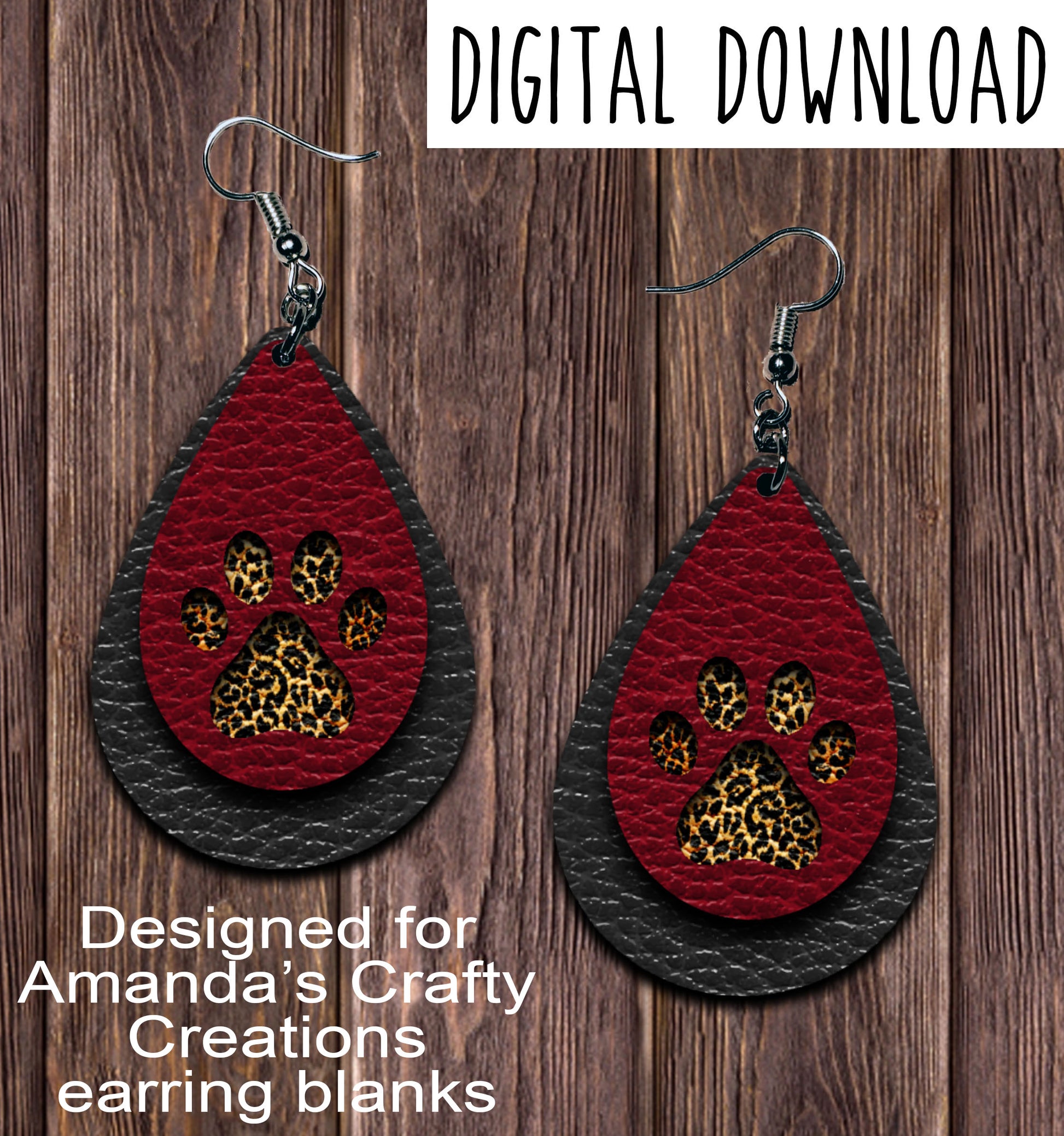 Black Dark Red Leopard Paw Print Teardrop Earring Sublimation Design, Hand drawn Teardrop Sublimation earring design, digital download, JPG, PNG