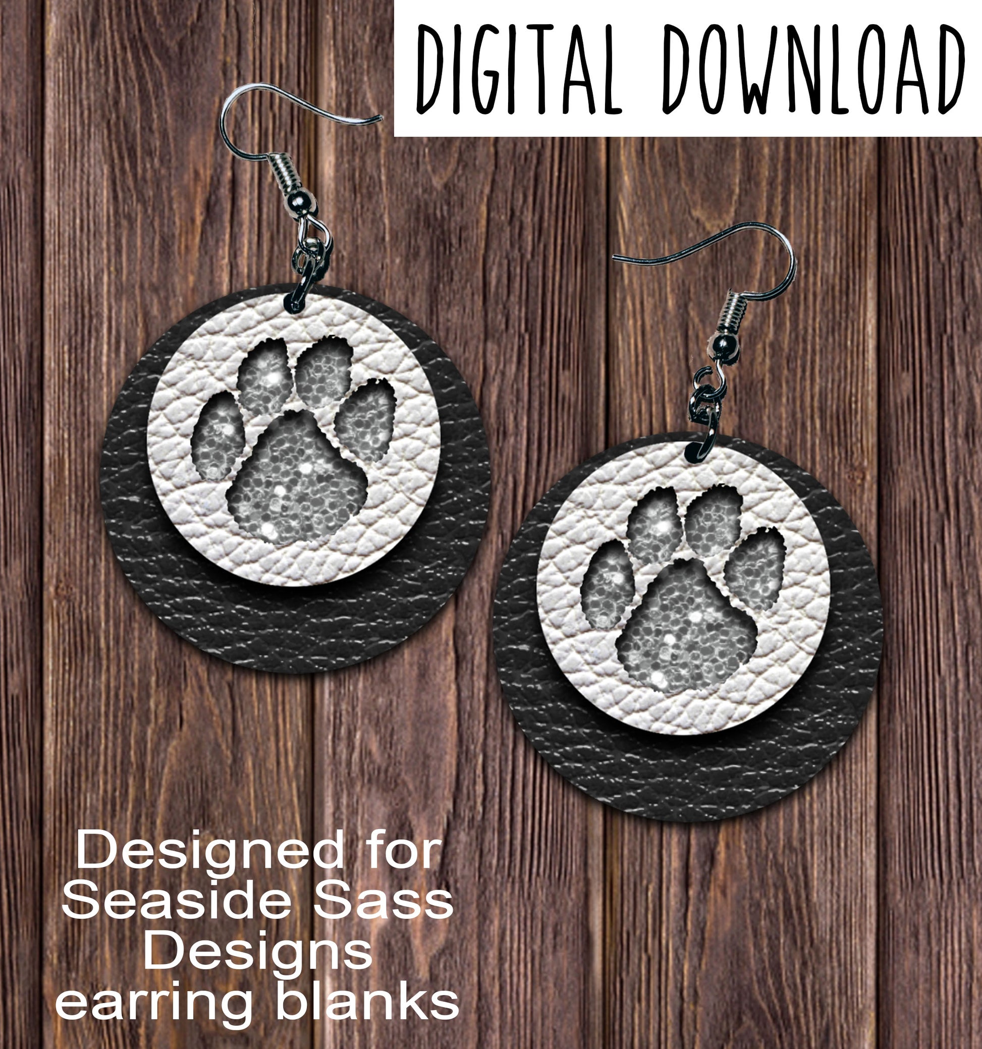 Black White Silver Chunk Paw Print Cut Out Circle Earring Sublimation Design, Hand drawn Circle Sublimation earring design, digital download, JPG, PNG