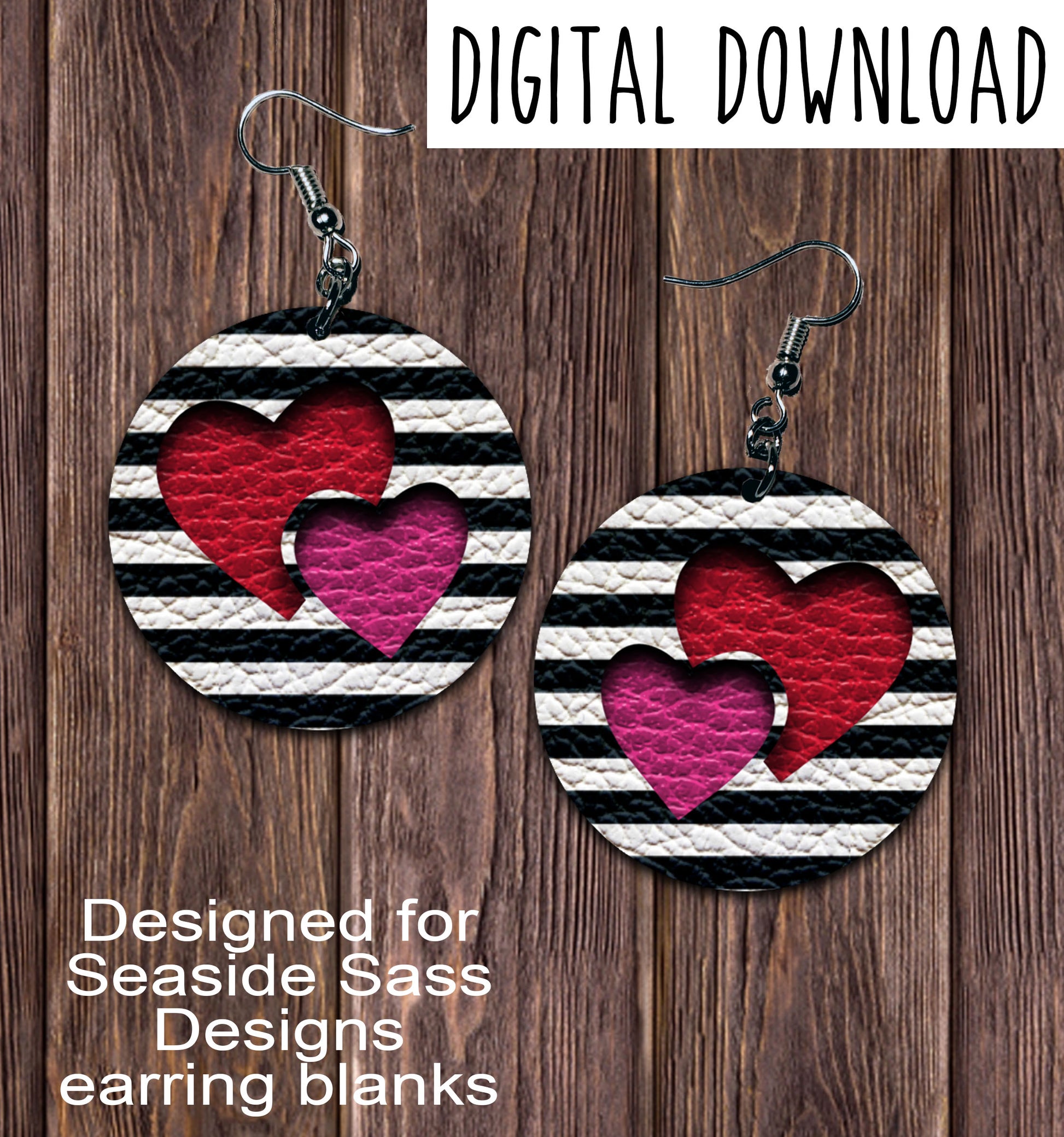 Black White Stripe Double Heart Cut Out Circle Earring Sublimation Design, Hand drawn Circle Sublimation earring design, digital download, JPG, PNG
