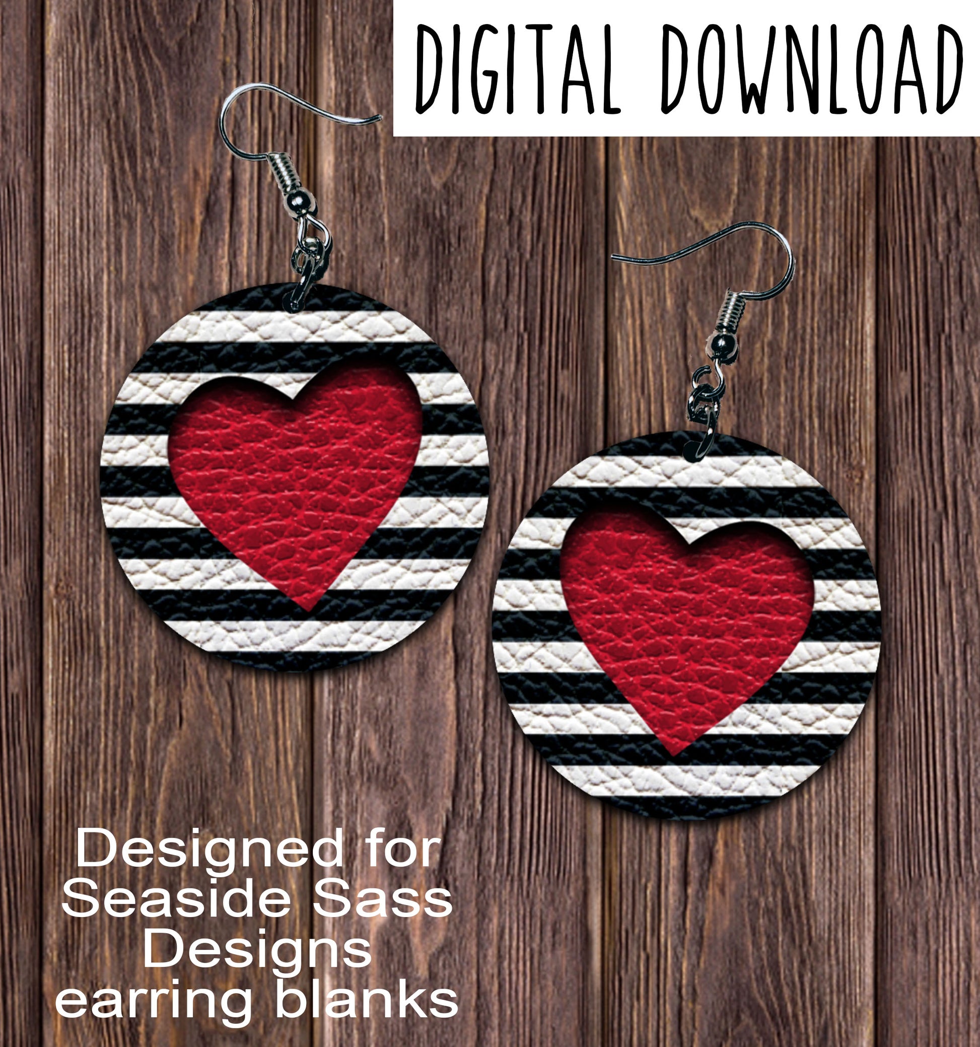Black White Stripe Red Heart Cut Out Circle Earring Sublimation Design, Hand drawn Circle Sublimation earring design, digital download, JPG, PNG