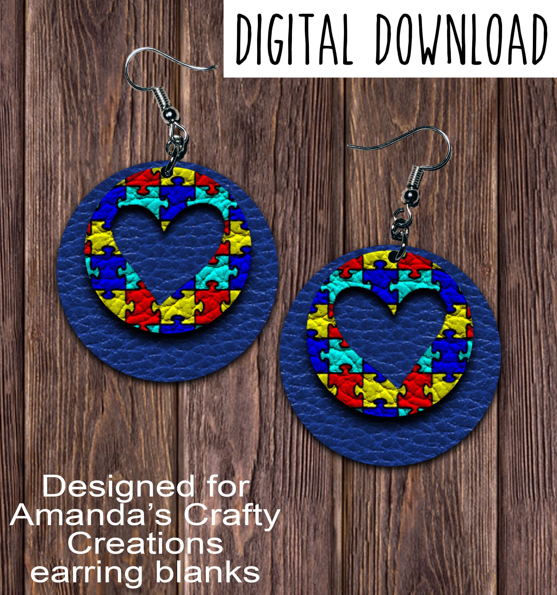 Blue Autism Puzzle Heart Cut Out Circle Earring Sublimation Design, Hand drawn Circle Sublimation earring design, digital download, JPG, PNG