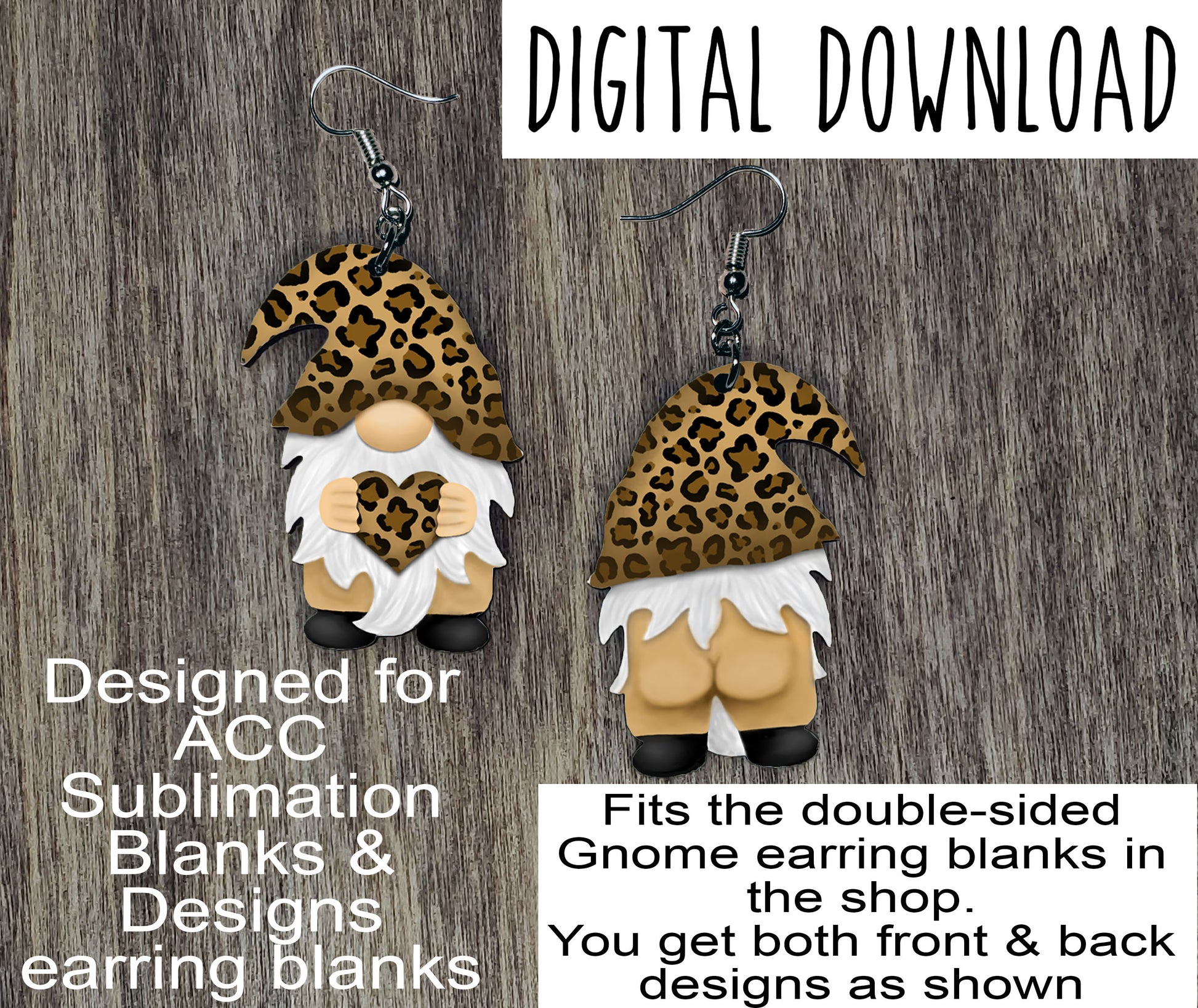 Double Sided Naked Gnome with Leopard Hat Sublimation Design, Leopard print heart naked gnome design, Hand drawn Gnome Sublimation earring design, digital download, JPG, PNG