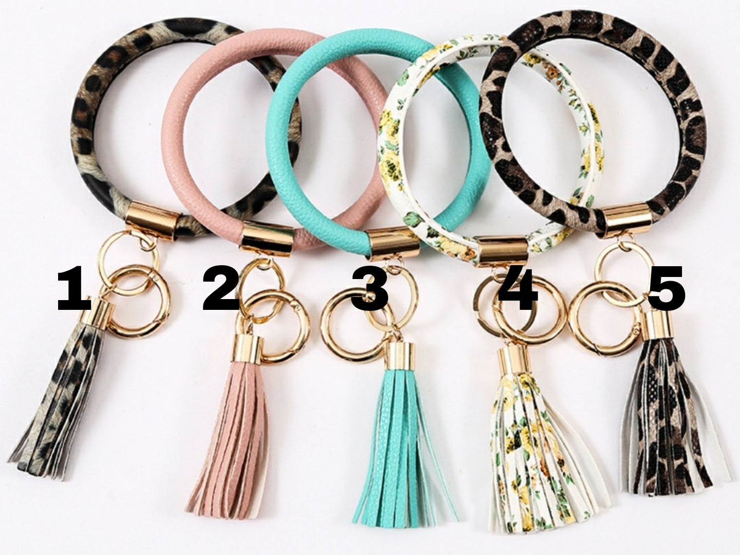 Product Description: This listing features PU leather wrapped keychain bracelets that come with a matching PU leather tassel and a sublimation metal disc for personalizing. Perfect for creating custom, stylish keychains.