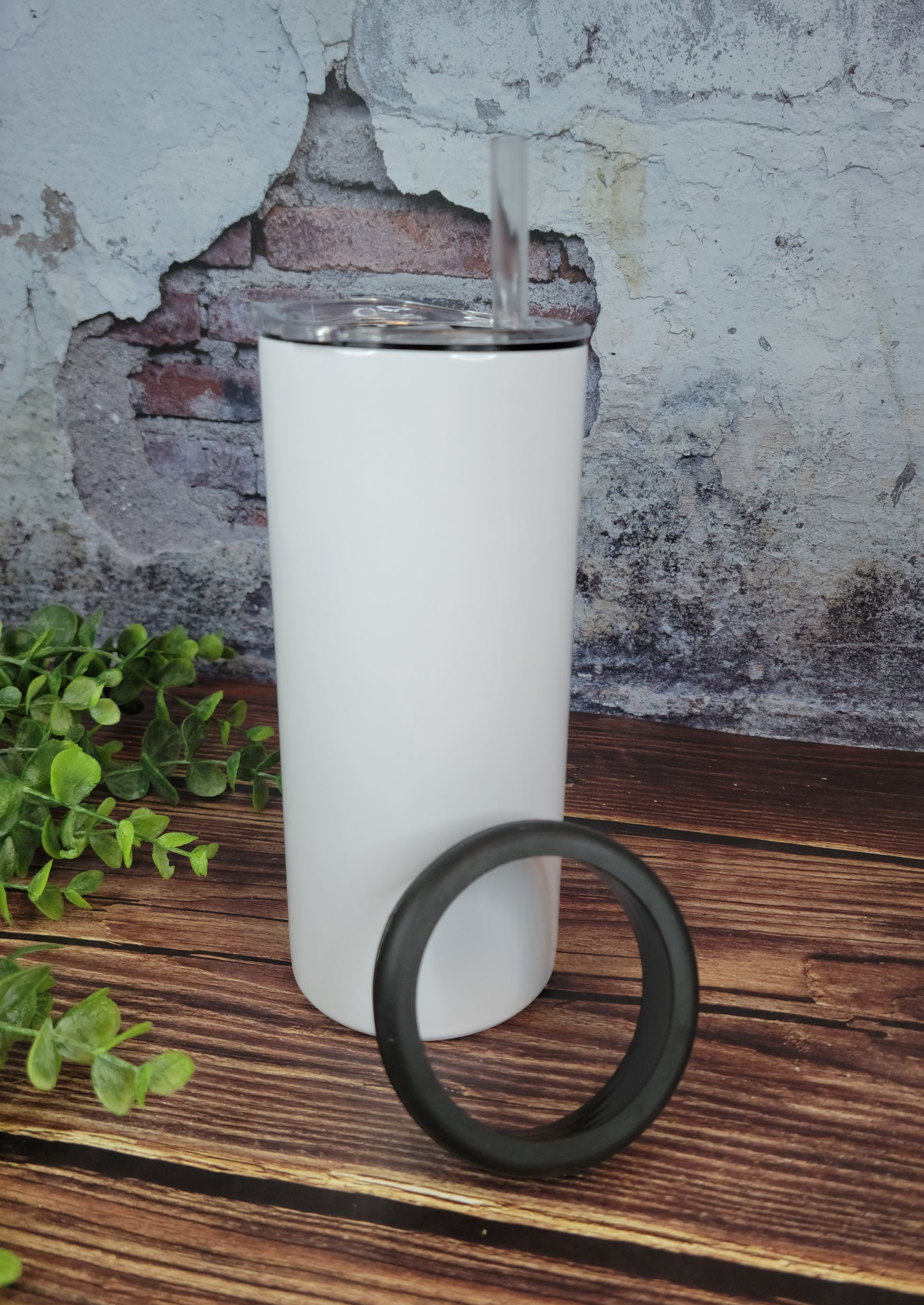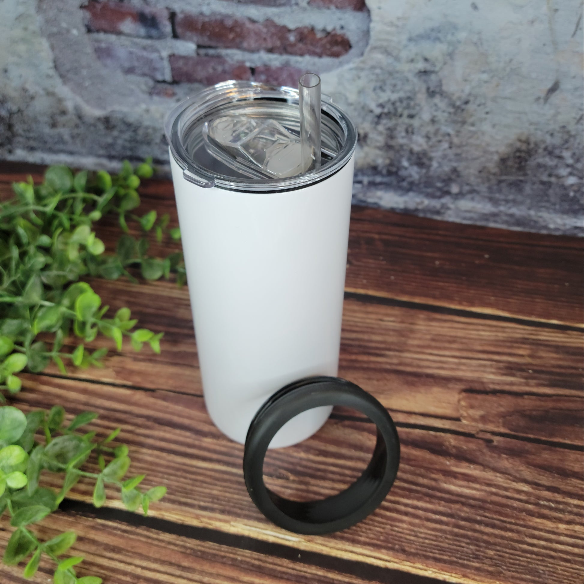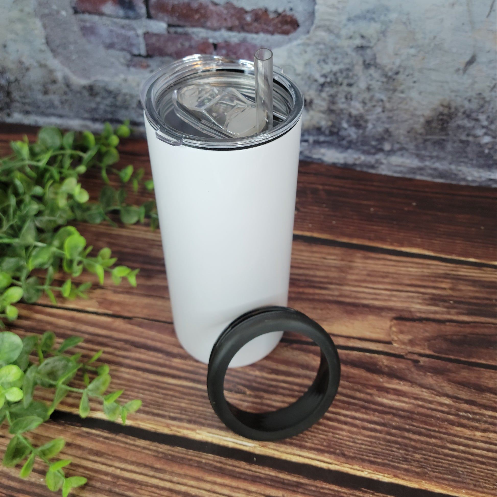 Includes screw on top for holding skinny cans and plastic straw (rubber bottom sold separately if desired)
