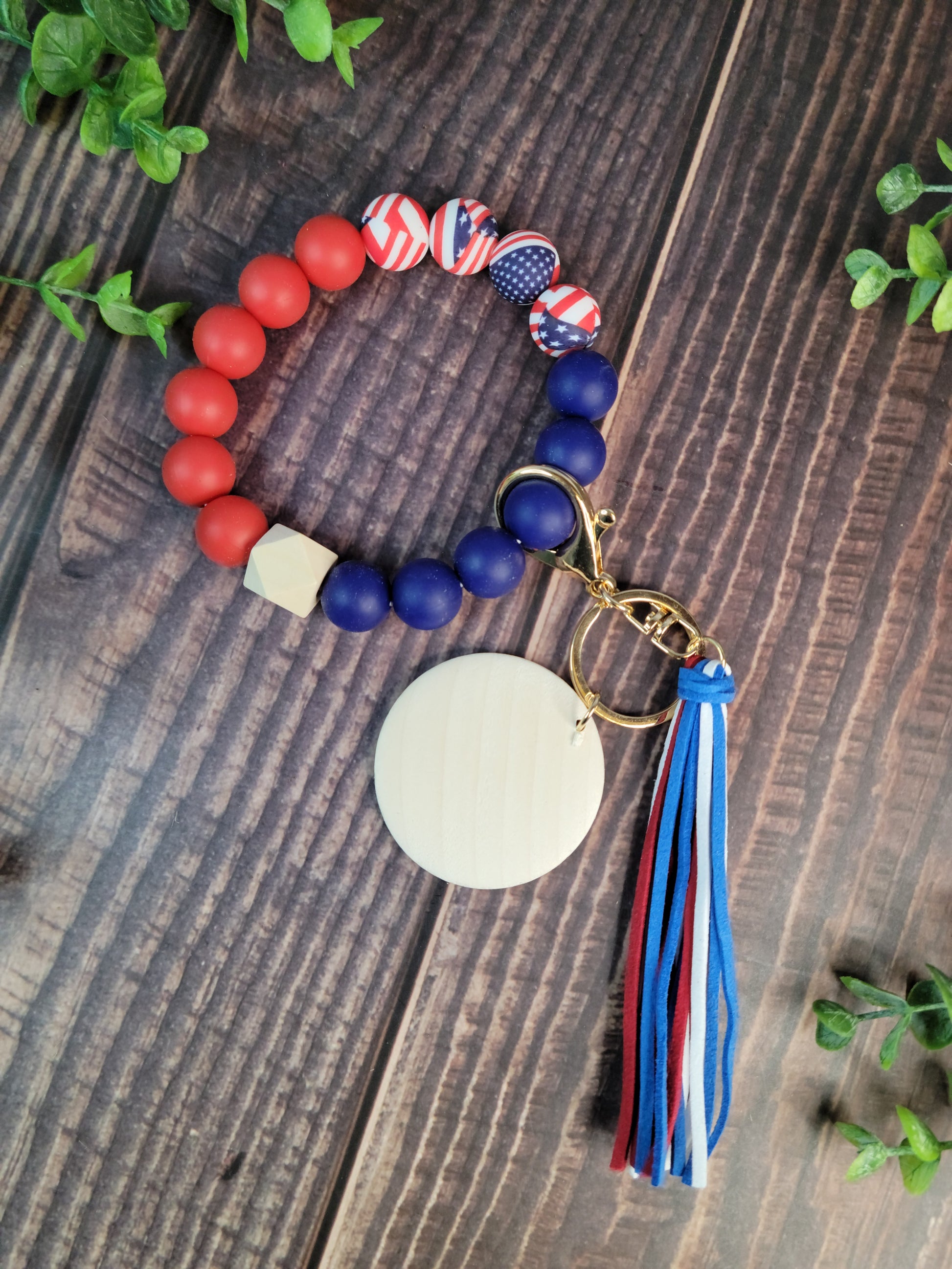 USA Flag Red White & Blue Silicone bead keychain bracelet, Flag wristlet, laser engraving blank, silicone bead wristlet, wood disc for engraving
