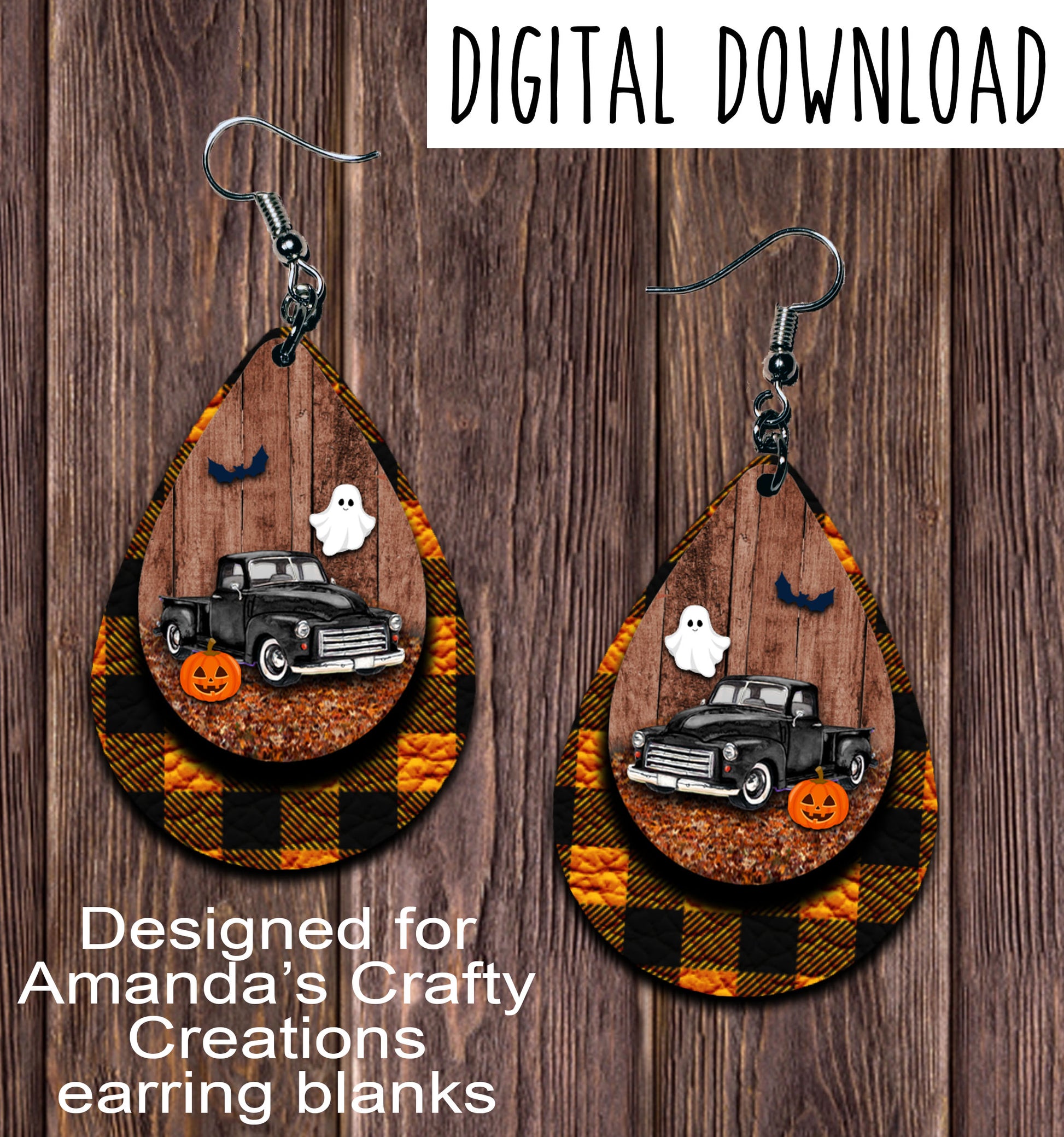 Vintage Black Truck Halloween Orange Plaid Teardrop Earring Sublimation Design, Hand drawn Teardrop Sublimation earring design, digital download, JPG, PNG