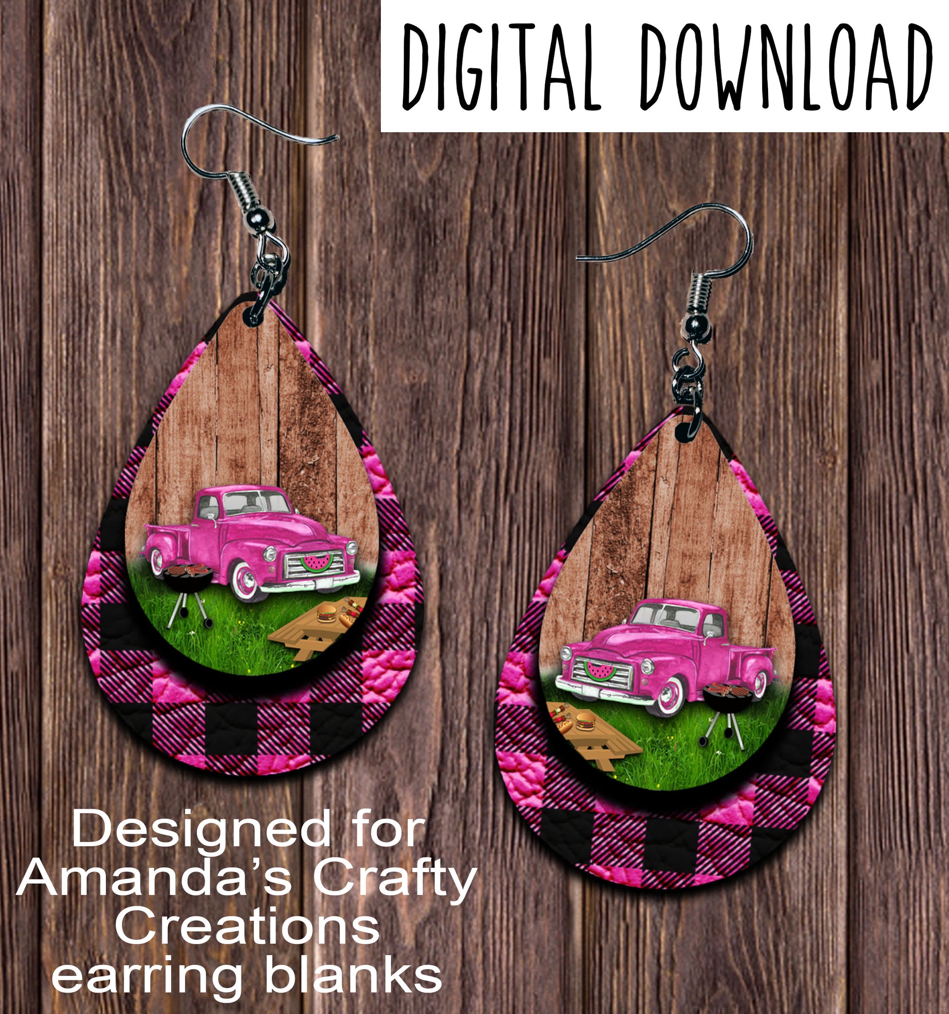 Vintage Pink Truck Summer Pink Plaid Teardrop Earring Sublimation Design, Hand drawn Teardrop Sublimation earring design, digital download, JPG, PNG