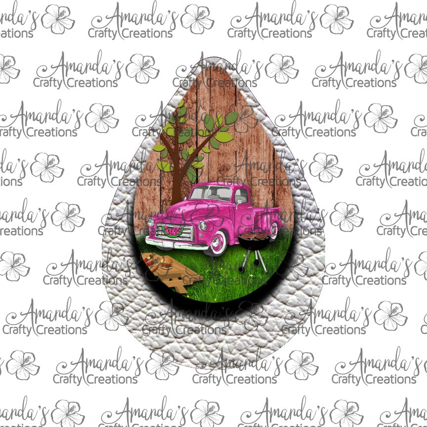 Vintage Pink Truck Summer Silver Teardrop Earring Sublimation Design, Hand drawn Teardrop Sublimation earring design, digital download, JPG, PNG