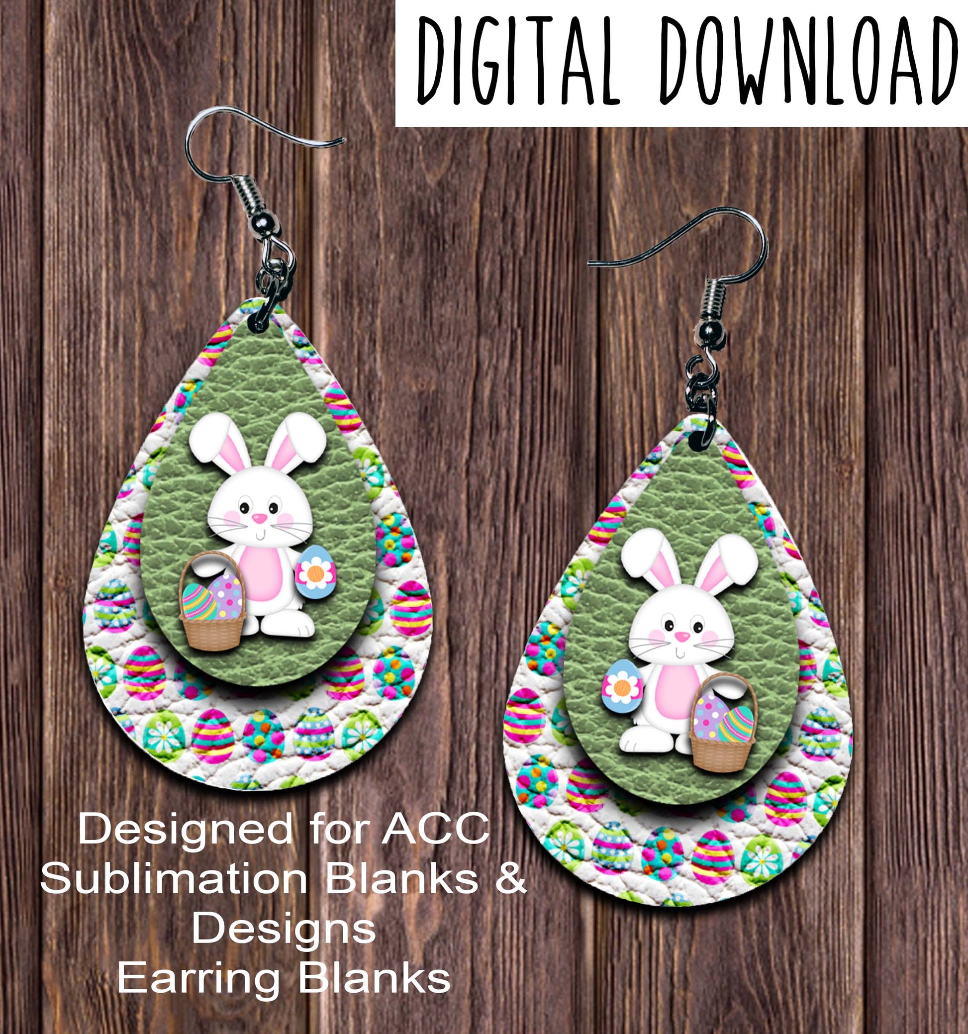 White Bunny Basket Light Green Teardrop Earring Sublimation Design, Hand drawn Teardrop Sublimation earring design, digital download, JPG, PNG