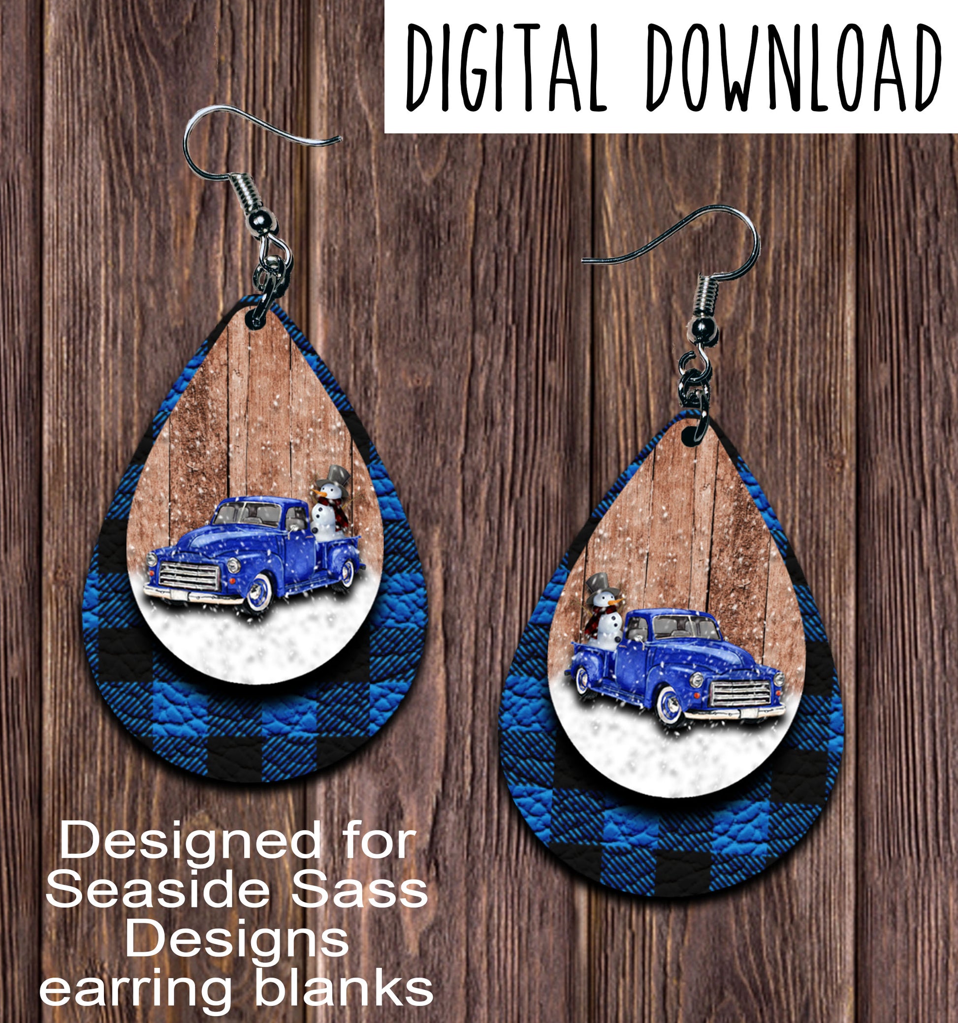Winter Blue Vintage Truck Blue Plaid Snowman Teardrop Earring Sublimation Design, Hand drawn Teardrop Sublimation earring design, digital download, JPG, PNG