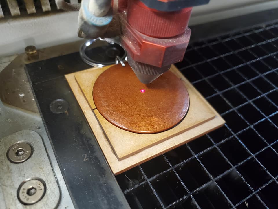 - Then glue the pieces on top of the scored area to create a perfect jig to use when engraving the wood disc key chains from this shop!